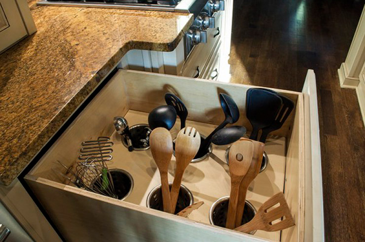 خب، اگر نمیتوانید با به هم ریختگی مجموعه کفگیر ملاقه خود در کشوها کنار بیایید، پس یک گزینه ذخیره سازی هوشمندانه این است که، کشوی بدون استفاده این وسایل را به صورت عمودی طراحی کنید. یعنی کشو را به صورتی طراحی کنید که قوطیهایی درون آن باشد که کفگیر ملاقهها را مانند تصویر به صورت عمودی داخل کشو قرار دهید.