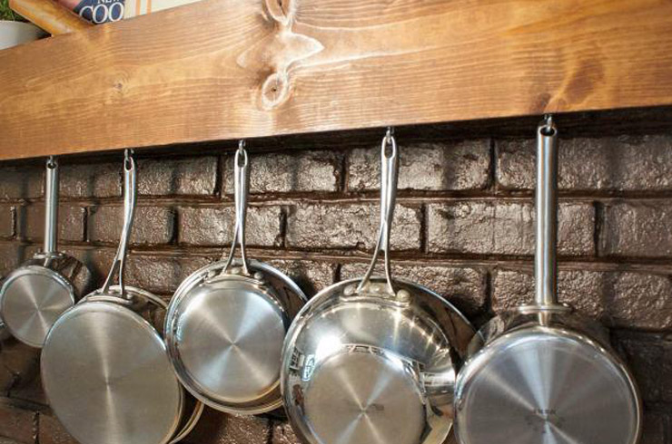 استفاده از فضای دیوار خود یک حرکت هوشمند در یک آشپزخانه کوچک است. این شلفهای ظریف طراحی شدهاند تا قابلمهها و ماهیتابهها را از پایین آنها آویزان کرد، اما همچنین میتوانید سایر اقلام آشپزخانه مانند کتاب آاشپزی، قهوه ساز کوچک یا قالب شیرینی پزی را در بالای شلفها ذخیره کنید و قرار دهید.