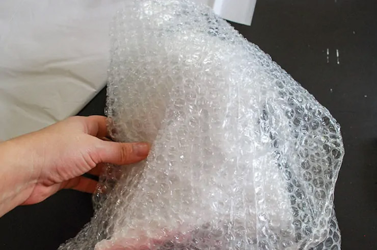 ۴. در نهایت، وسیله را با نایلون حبابی بپوشانید. همیشه نایلون حبابی را به صورتی که حبابهای آن به سمت خارج باشد استفاده کنید و مطمئن شوید که نایلون به طور مساوی وسلیه را پوشانده است.