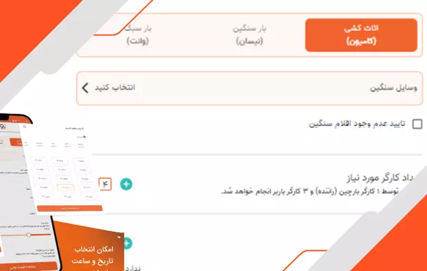 انتخاب نوع خودرو: با توجه به حجم بار، میتوانید نوع خودرو مورد نظر خود را انتخاب کنید.